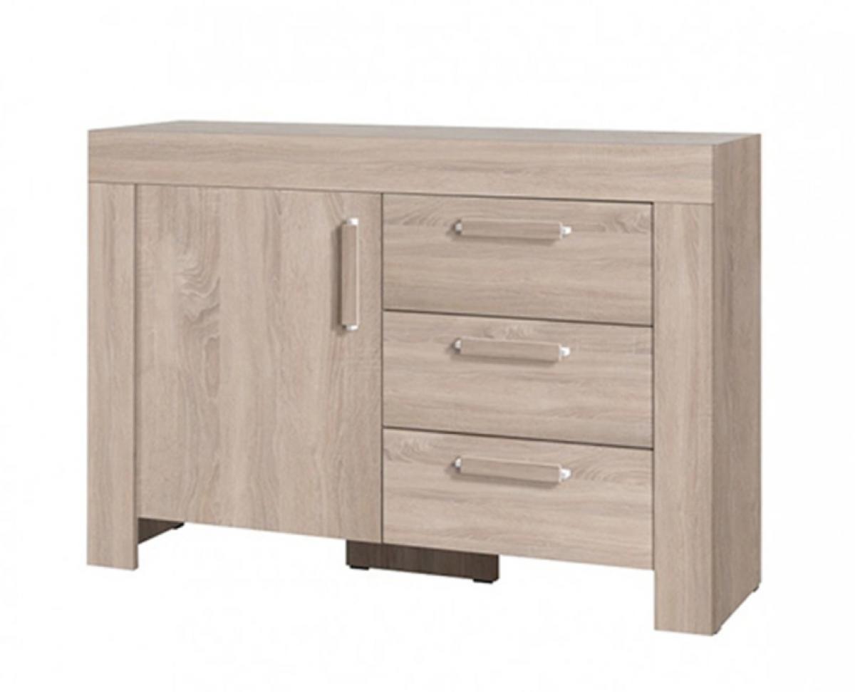 The CEZAR system is a modern room furniture prepared in two colour variants: Sonoma or Milano with white fronts. Chest of drawers made of high quality laminated plate, equipped with shelves hidden behind the closed door and three roomy drawers. It will be an ideal complement to the room arrangement with other Caesar series furniture.